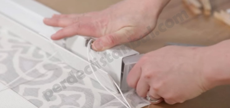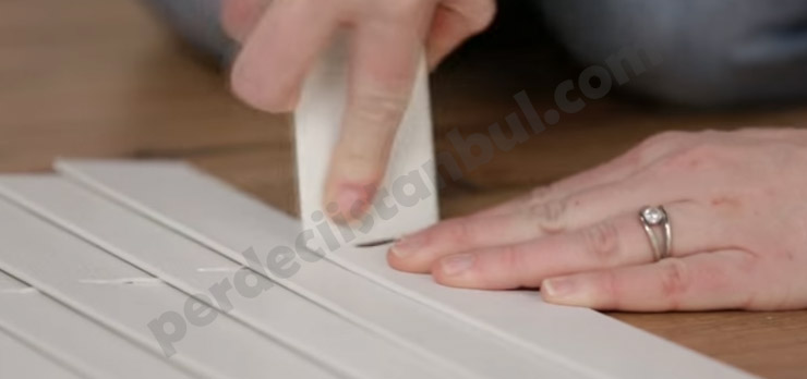6) Ölçme ve konumlandırma işlemi bittikten sonra perdenin her iki tarafında jaluzi şertilerimizi 2, 3 parmak örtecek kadar kumaş kaldığından emin olmalıyız.