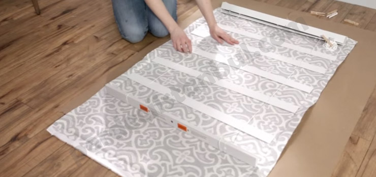 11) Jaluzi şeritleri ve kumaş birbirine yapıştırıldıktan sonra sıkıca bastırılır ve mandal yardımıyla sabitlenir.