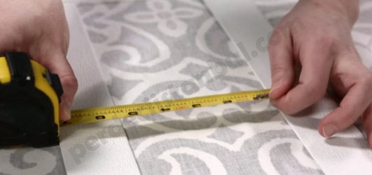 5) Jaluzi şertilerimizi kumaşımızın üzerine eşit ve düzgün mesafelerle yerleştiriyoruz. Mesafenin eşit olduğundan emin olmak için şeritlerin her iki yanını şeritlerin aralarındaki mesafeyi mezura yardımıyla ölçüyoruz.